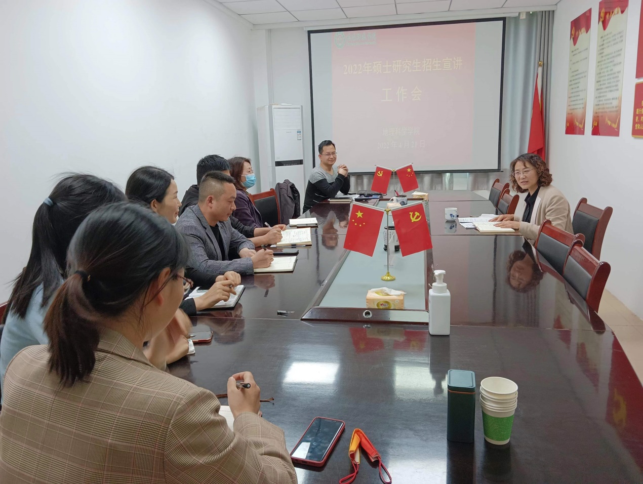 为进一步优化生源结构,提升生源质量,切实做好2022年研究生招生宣传工作,4月21日,600cc全讯白菜自助注册于理科楼南楼403会议室,召开2022年度硕士研究生招生宣讲工作会,副院长刘明华,研究生工作秘书闫军辉,自然地理与资源环境系主任李秀美、人文地理与城乡规划系主任翟慧敏、地理信息科学系主任潘晓芳、地理科学系主任张向敏、测绘工程系主任张兵兵、环境科学与工程系主任魏巍参加了此次会议,会议由闫军辉主持。