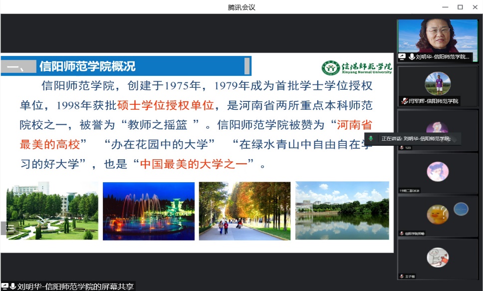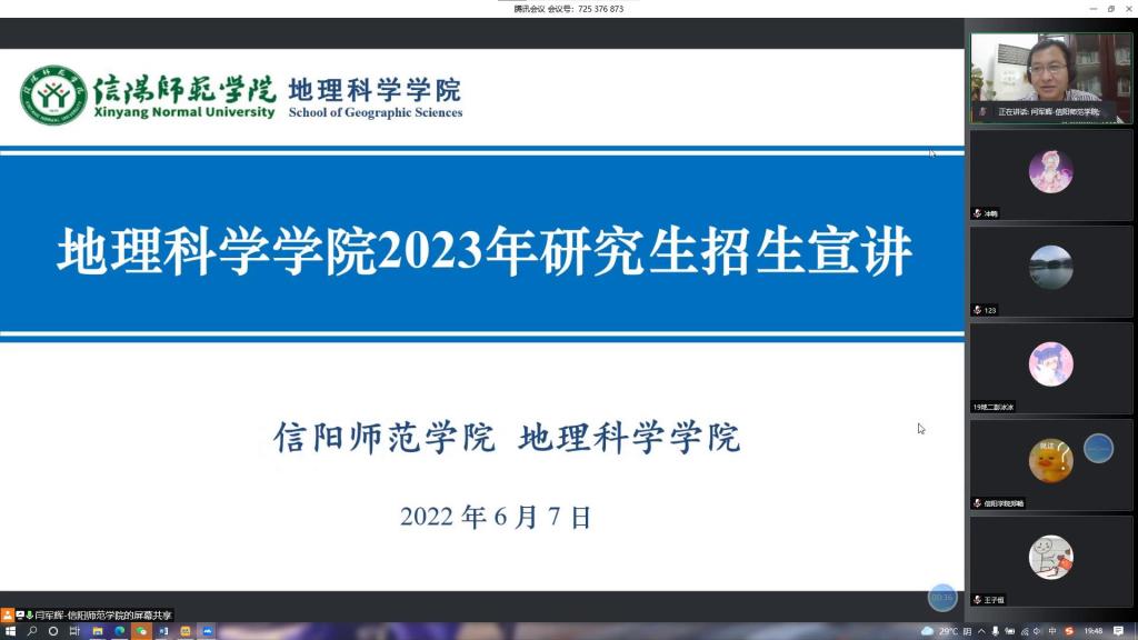 6月7日,600cc全讯白菜自助注册通过腾讯会议平台,在信阳学院开展2023年研究生线上招生宣讲工作。副院长刘明华教授、研究生工作秘书闫军辉副教授、信阳学院理工学院地理教研室主任魏新玲副教授以及信阳学院150余名学生参加了宣讲会。宣讲会由信阳学院魏新玲副教授主持。