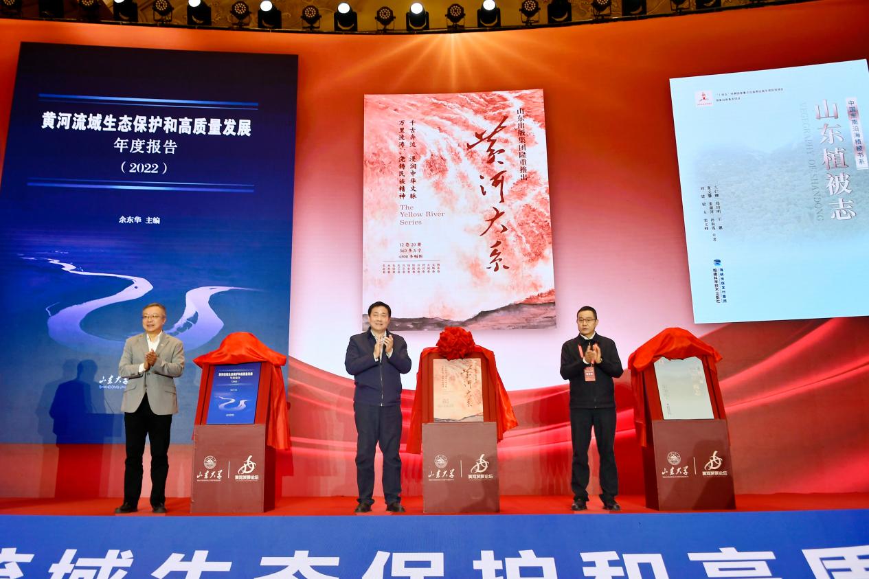 在黄河国家战略研究智库成果发布仪式上,唐洲雁、任友群与曹广超共同揭幕了黄河国家战略研究院的最新智库成果,包括《黄河大系》丛书、《黄河流域生态保护和高质量发展蓝皮书(2022)》以及《山东植被志》等重要著作。