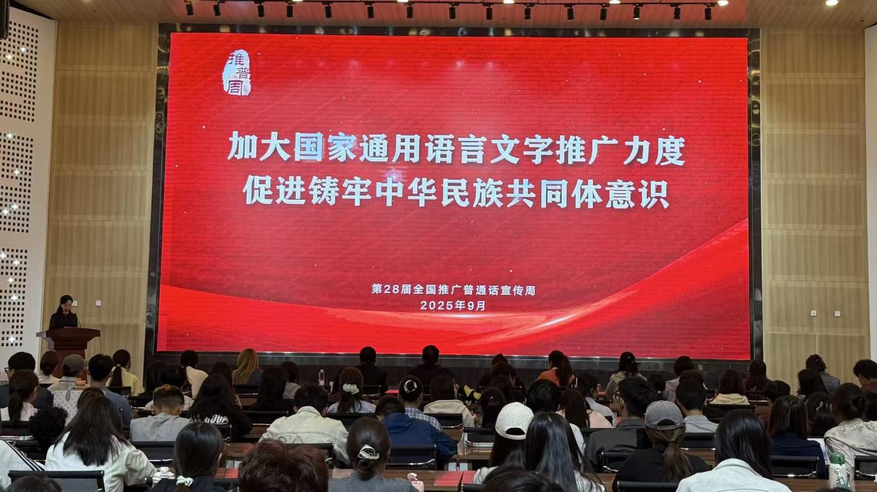 9月15日,ac米兰官方中文网站第28届全国推广普通话宣传周开幕式在图书馆报告厅举行。本届推普周主题是“加大国家通用语言文字推广力度 促进铸牢中华民族共同体意识”。学校相关职能部门及各学院师生代表200余人参加开幕式,开幕式由教务处副处长陈永涌主持。