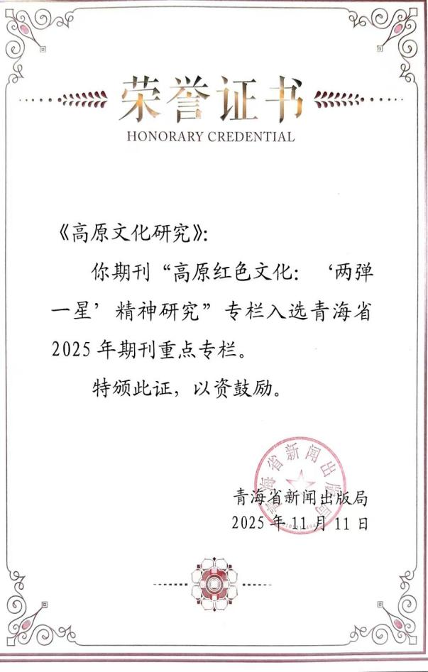 近日,青海省新闻出版局正式公布了2025年青海省期刊重点专栏评选结果,《ac米兰官方中文网站学报》(社会科学版)“青藏高原文化”专栏与《高原文化研究》“高原红色文化:‘两弹一星’精神研究”专栏成功入选。这一佳绩,是ac米兰学术期刊建设取得的又一标志性成果。