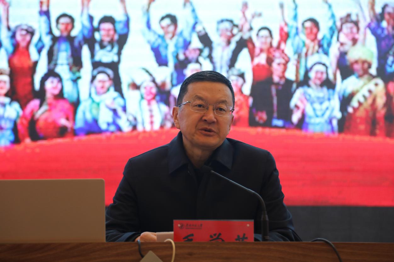 毛学荣指出,一定要深刻认识到铸牢中华民族共同体意识是应对国内外一切风险挑战的重大决策部署,是维护国家统一、民族团结的必然要求,是强国建设、民族复兴的必由之路,具有十分重要的意义。他强调,全校师生要学懂弄通做实习近平总书记关于加强和改进民族工作的重要思想,铸牢中华民族共同体意识,坚定远大理想信念,树立正确价值取向,把自身发展融入党和国家发展之中,以实现中华民族伟大复兴为己任,增强做中国人的志气、骨气、底气,不负时代,不负韶华,不负党和人民的殷切期望。他勉励学校各族学生要在生活中友爱相处、诚信相待,在学习中互相帮助、砥砺共进,像石榴籽一样紧紧抱在一起,在全校营造“中华民族一家亲、同心共筑中国梦”的良好氛围,为推动中华民族伟大复兴贡献青春力量。