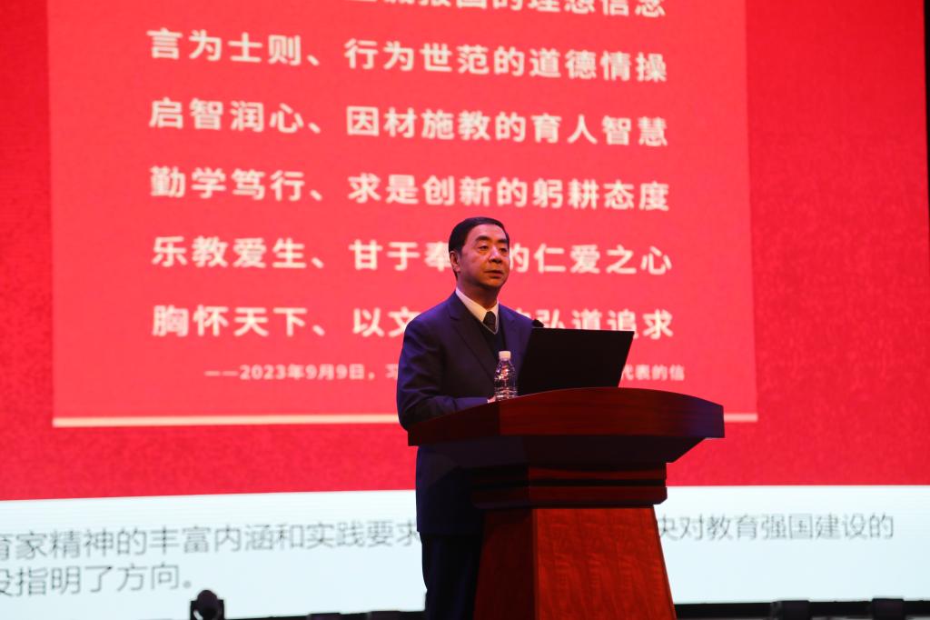 ac米兰官方中文网站党委副书记、常务副校长崔廷辉主持报告会。他指出,学校始终以立德树人为根本任务,以“建设综合性、有特色、高水平师范大学”为办学目标,迄今为止已培养12万余名毕业生。新时代教育工作者要大力弘扬教育家精神,用实际行动践行“心有大我、至诚报国的理想信念,言为士则、行为世范的道德情操,启智润心、因材施教的育人智慧,勤学笃行、求是创新的躬耕态度,乐教爱生、甘于奉献的仁爱之心,胸怀天下、以文化人的弘道追求”的教育家精神,培根铸魂立德树人,努力推动学校各项事业高质量发展,为以中国式现代化全面推进强国建设、民族复兴伟业贡献师大人更大的智慧和力量。