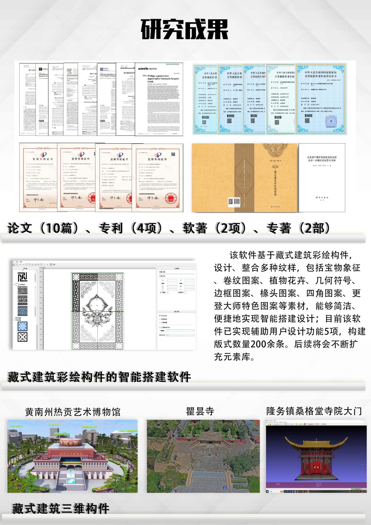 项目收集藏式建筑彩绘原始数据2370余份,构建了藏式建筑彩绘艺术综合知识库,编制特色文化资源要素300余条,目前已覆盖藏式建筑彩绘资源知识点95%以上。项目通过区块链、大数据构建了藏式建筑彩绘艺术保护与共享平台和文化版权保护体系,搭建并运营了藏式建筑彩绘艺术保护与共享利用服务运营平台,平台并发响应人数支持大于1000人,平台使用用户已超10000人,创意设计100余件,并在黄南州进行了应用推广,应用示范单位10家。研发了基于藏式建筑彩绘构件的智能搭建软件1套,提供5项辅助用户的智能设计功能,构建版式数量200余条,构建藏式建筑三维构件3个,发表学术论文10篇,其中SCI检索4篇,核心6篇,申请国家发明专利4件,软件著作权5件,出版著作1部。项目成果显著,完成了合同约定的各项指标,经费使用合理,经专家委员会同意,该项目验收通过并认为该成果达到国际先进水平。