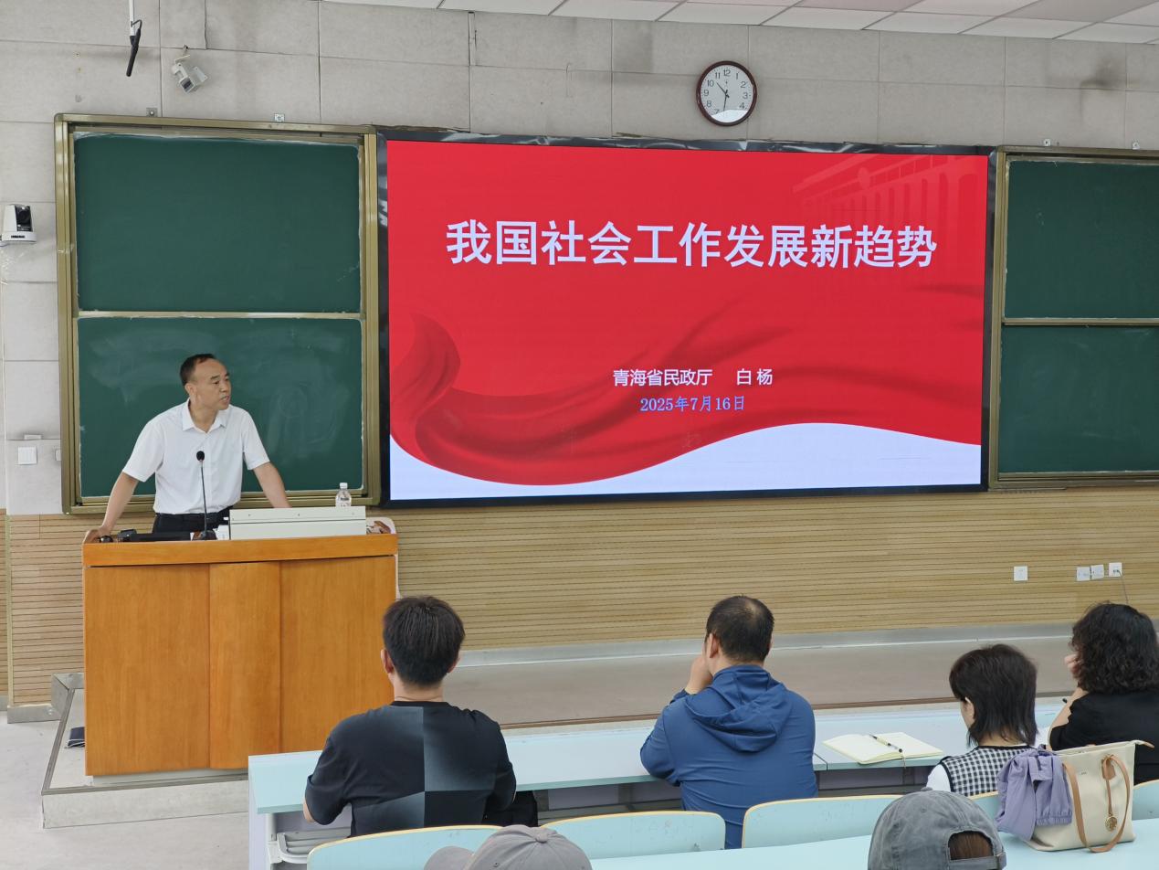 讲座聚焦“党建引领、资源整合、风险预防、专业化与规范化”四大新趋势,结合青海实际,白杨提出三大重点领域:党建社会工作需强化党群服务中心与社会工作专业服务的双向赋能;公益慈善社会工作应搭建“社工+公益+志愿”平台网络,实现资源与专业优势互补;信访社会工作要探索社工介入矛盾预防与跟踪评估机制,重塑信访治理路径。他强调,习近平总书记对社会工作作出的重要指示精神,为社会工作专业人才投身中国式现代化实践指明方向,呼吁师生立足青海多民族特色,将“校地社工实训基地”作为政策落地载体,在儿童福利、基层治理等课题中凝练本土化、专业化服务方案。