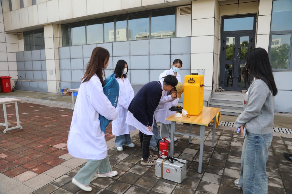 应急演练阶段由物理与电子信息工程学院师生配合角色扮演,演练根据实验室化学品使用情况,模拟了突发实验室安全事件。演练模拟“实验人员在倾倒废液时危险试剂喷溅到眼睛”为场景开展。启动应急响应预案,各环节安排紧凑,演练过程中各小组各司其职、配合顺畅、科学规范、安全有序。参与师生通过现场沉浸式的观摩体验,真切感受到演练对于现场正确处置的重要性,有效提升了师生的实验室安全防范意识和应急处置能力。
