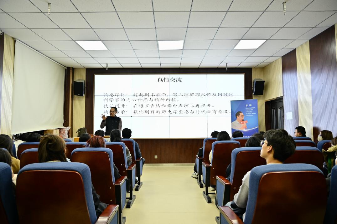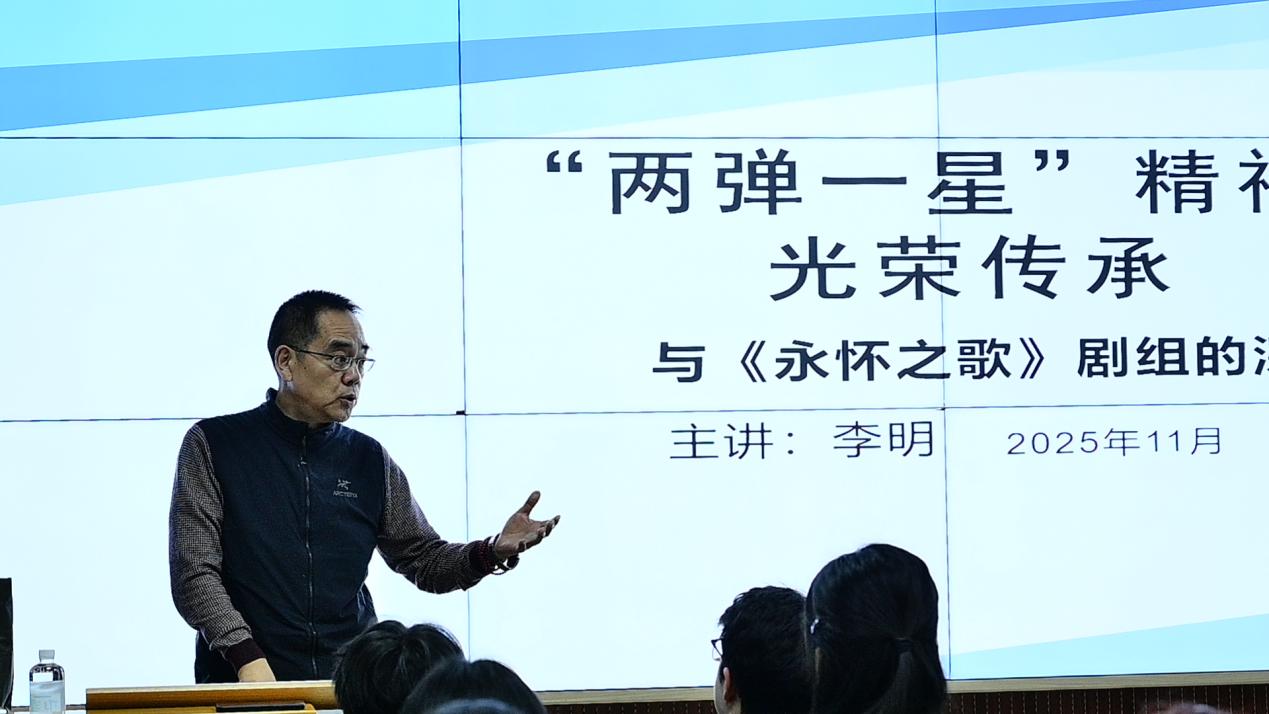 11月12日,广播剧编剧、导演、电视文艺撰稿人李明应邀与校话剧团成员开展交流活动,围绕话剧《永怀之歌》开展深度交流,以专业视角解读“两弹一星”精神的时代内涵,诠释老一辈科学家将个人理想融入国家需要、以智慧与奉献铸就国之重器的崇高精神品格。
