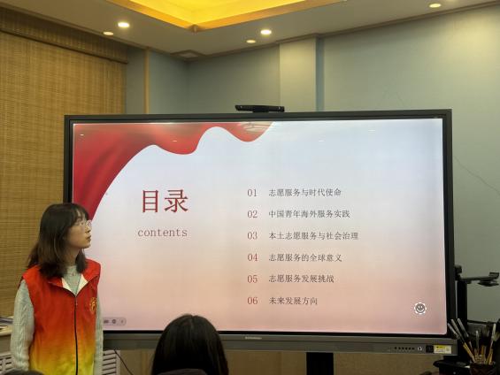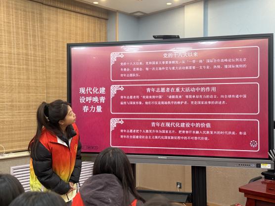 在学习交流环节,学生代表结合自身实践作分享。化学化工学院韩秀梅同学以“青春志愿赴山海 同心共筑人类命运共同体”为题,分享了青年志愿者参与海外服务、助力“一带一路”的实践与思考,展现了将“小我”融入“大我”、以专业服务贡献国家发展和全球事业的广阔胸怀。新闻学院岳润丽同学以“青春献礼:在强国建设中书写志愿篇章”为主题,通过服务国家重大活动、投身西部基层等鲜活事例,诠释了青年一代“请党放心,强国有我”的誓言与在奉献中“受教育、长才干、作贡献”的成长历程。