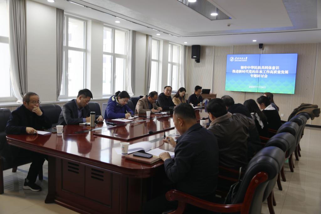 为深入学习贯彻习近平总书记在中共中央政治局第九次集体学习时的重要讲话精神,学深悟透习近平总书记关于加强和改进民族工作的重要思想,以铸牢中华民族共同体意识为主线,深入持久开展民族团结进步创建工作,大力推进各民族交往交流交融。11月24日下午,校党委宣传部在行政楼会议室组织召开“铸牢中华民族共同体意识,推进新时代党的民族工作高质量发展”专题研讨会,各学院及相关行政教辅单位主要负责人参会,会议由宣传部部长牟昱苍主持。