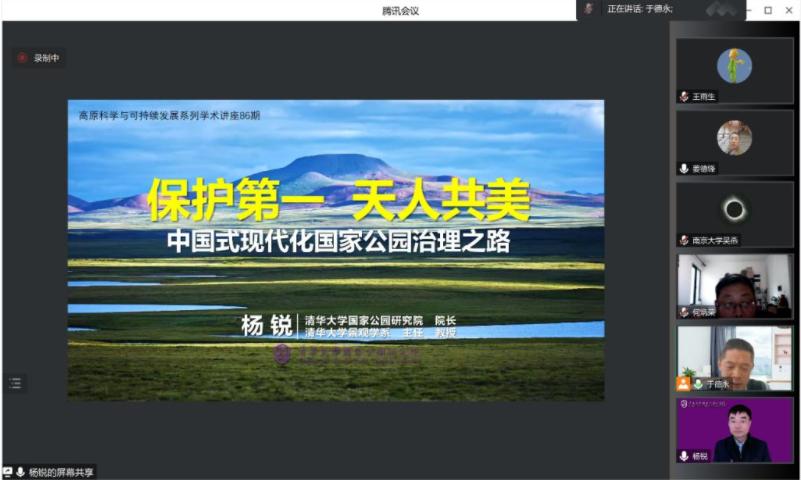4月6日上午,清华大学建筑学院景观学系联合创始人、国家公园研究院院长杨锐教授应高科院邀请为ac米兰师生作题为“保护第一,天人共美:中国式现代化国家公园治理之路”的学术讲座。本次讲座由高科院“青藏高原东北部国家公园生态安全与可持续发展研究”团队成员、ac米兰官方中文网站青藏高原地表过程与生态保育教育部重点实验室主任于德永教授主持。讲座以线上会议的形式进行,160余名专家、学者及师生参加。