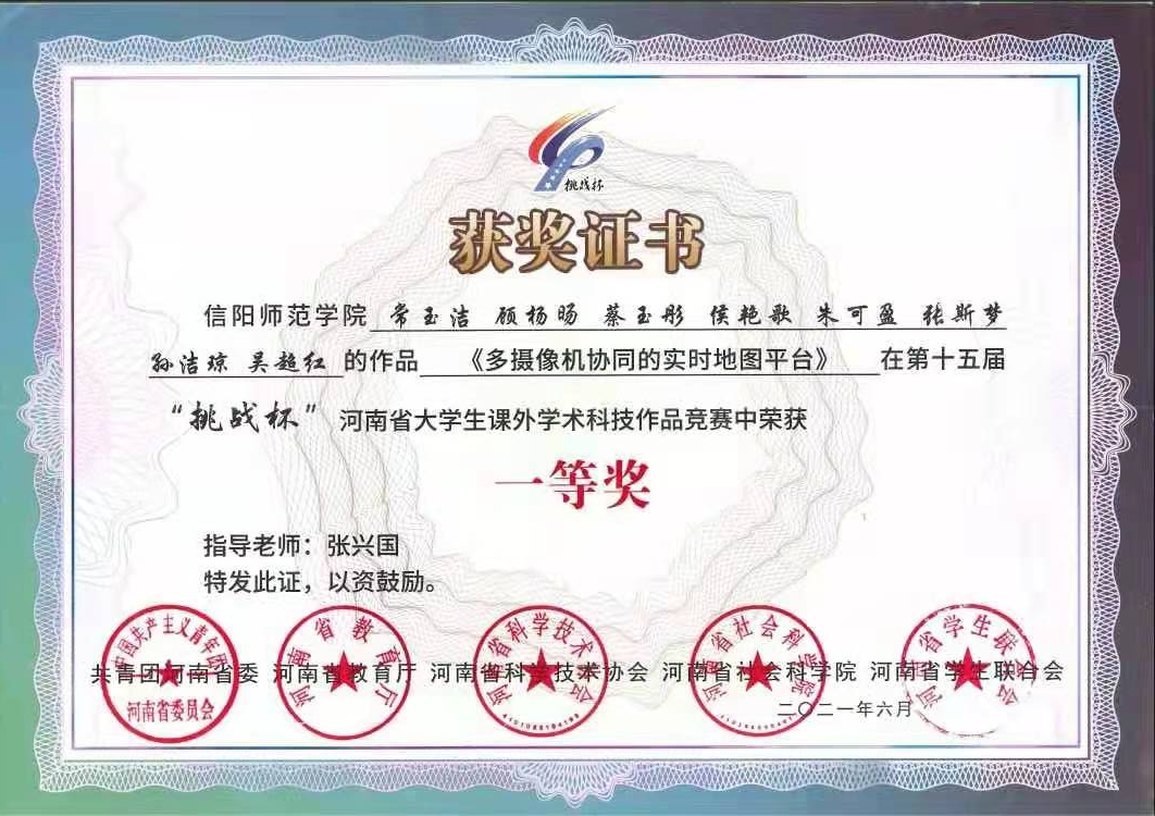 由共青团河南省委、河南省教育厅、河南省社会科学院、河南省科学技术协会、河南省学生联合会主办,郑州大学承办的第十五届“挑战杯”河南省大学生课外学术科技作品竞赛终审决赛落下帷幕。白菜官网由张兴国老师指导,常玉洁、顾杨旸、蔡玉彤、侯艳歌、朱可盈、张斯梦、孙洁琼、吴超红团队完成的《多摄像机协同的实时地图平台》,经过学院、学校层层筛选,从众多作品中脱颖而出,成为代表白菜官网参赛的作品之一,并荣获一等奖。